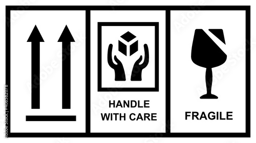 Fragile package icon, handle with care logistics and delivery shipping label.