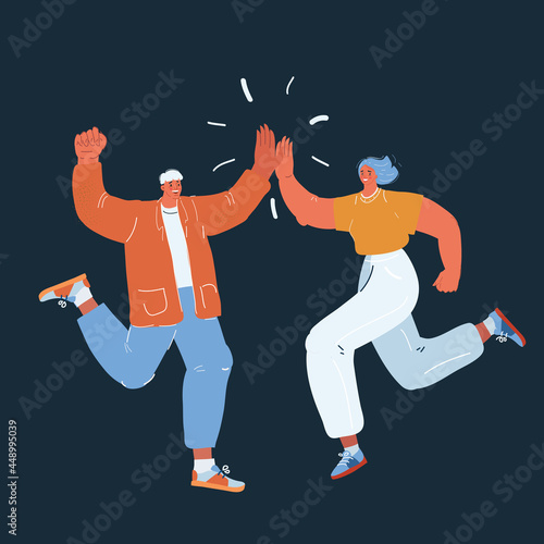 Vector illustration of success and winning concept - happy business team giving high five. Man and woman over dark backround.