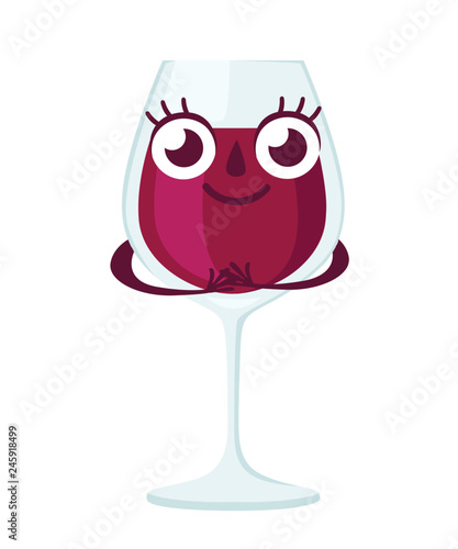 Glass of red wine, cartoon character design. Alcohol mascot. Transparent glass. Flat vector illustration isolated on white background