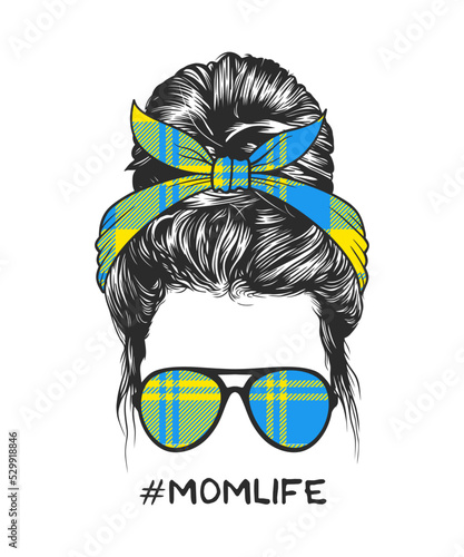 Peace Love Momlife. Woman face with aviator glasses bandana and leopard print. Messy Bun Mom Lifestyle. Vector illustration.  Isolated on white background. Good for posters, t shirts, postcards.