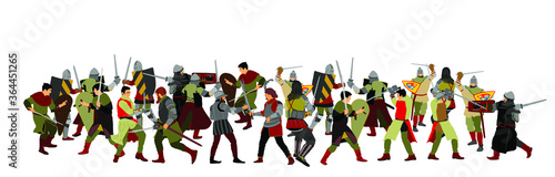 Knights in armor with sword fight vector illustration isolated on white. Medieval fighters in battle. Hero protects castle walls. Armed man defend honor of family people. Protect country against enemy