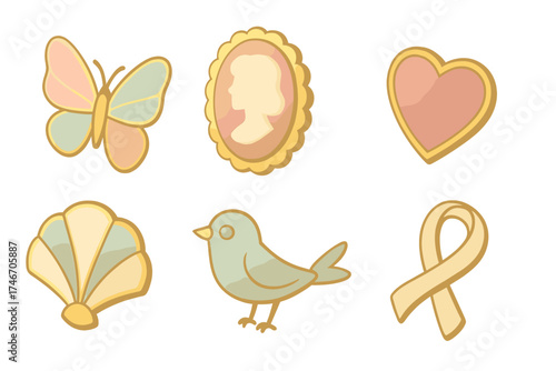 Elegant Brooch Collection. Isometric vector illustration set Enamel Brooch Variants and Styles: butterfly-shaped brooch with