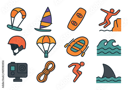 Many different icons for water sport activities displayed together. Perfect for summer event posters, sports websites, and vacation brochures. editable stroke. vector illustration