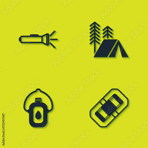 Set Rafting boat, Tourist tent with flag, Canteen water bottle and icon. Vector