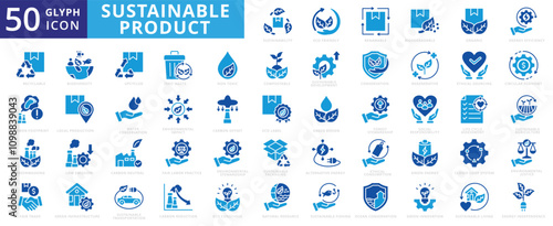 Sustainable product icon set with eco friendly, renewable, biodegradable, organic, efficiency, recyclable, carbon neutral, organic, recycling, greenhouse, biodiversity, zero waste, and conservation