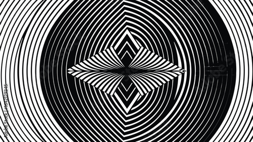 A striking abstract black and white illustration showcasing an intense burst of thin lines radiating dynamically from a central point, creating a powerful visual impact.