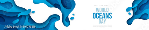 World Ocean day header template, blue waves paper cut style. Vector illustration. Papercut art banner underwater sealife. Sea marine life abstract concept. Save water ecology poster. Place for text