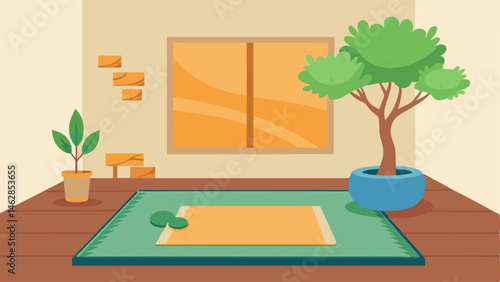 Woman practicing downward dog yoga pose on purple mat with green plant indoors vector illustration