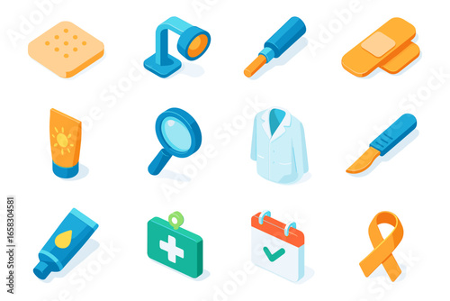 Colorful isometric icons set featuring medical and office supplies