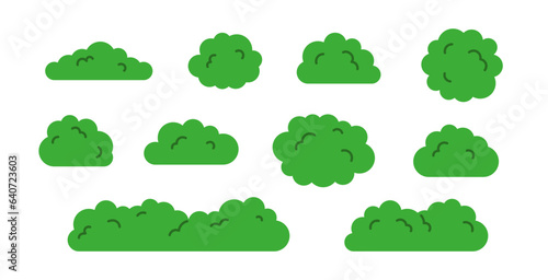 Set of vector bush illustrations on a white background. Green flat bushes on white background. Green grass vector set. Shrub bush shrubbery tree simple abstract. Eco element, foliage, stylized ecology