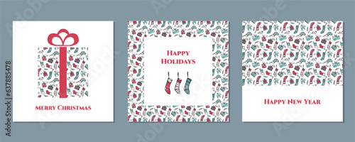 Holiday Merry Christmas card. Christmas stocking. Holiday socks set. Cartoon New Year vector eps 10 illustration isolated on white background in a flat style.