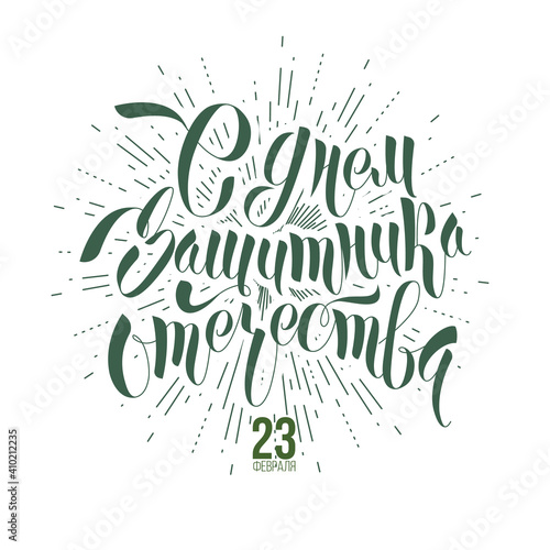February 23 Defender of Fatherland Day Russian text translation. Ornate lettering template greeting card