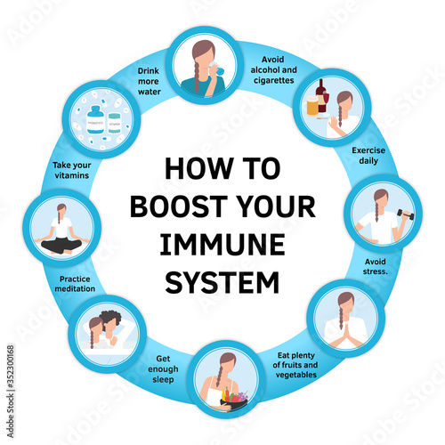 Information banner how to boost your immune system. Healthy habits for protection of human body health from diseases caused by viruses and bacteria. Vector infographics and text.