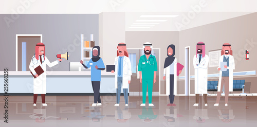 arab male doctor holding loudspeaker shouting through megaphone arabic doctors team meeting conference hospital medicine workers group clinic corridor interior full length flat