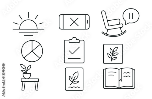 Sleep-Friendly Icons. Outline icon set of sleep-friendly work habits: focus timer, break reminder app,