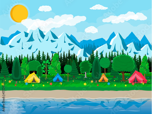 Forest and mountain landscape camping near lakes and mountains Cartoons with camping spots, outdoor recreation, in the middle of the forest.
