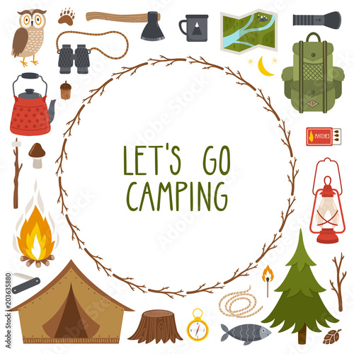 Vector round frame made from camping equipmen, wreath from branches and text "Let's go camping"