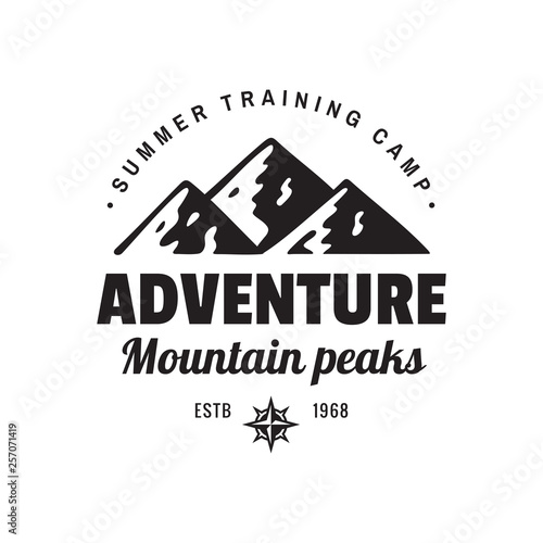 Adventure mountain peaks - concept logo badge for t-shirt clothing. Retro vintage style. Fashion graphic design. Explore expedition. Summer training camp. Creative emblem. Black & white colors.