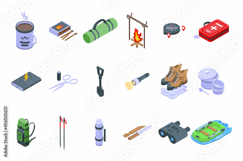 Expedition icons set isometric vector. Hiker adventure. Alpine outdoor