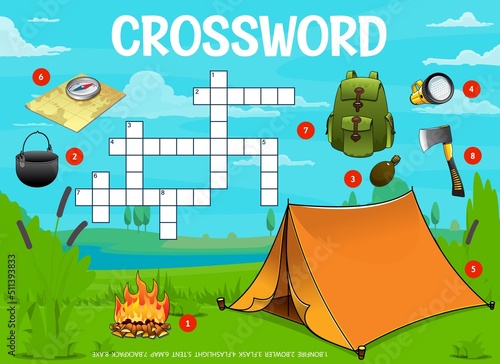 Camping travel crossword grid worksheet, find word quiz, vector game puzzle. Crossword riddle grid to guess words of camp tent, bonfire and bowler, flashlight and camper backpack, axe and map