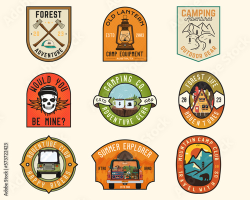 Camping Adventures badges set designs with mountains, camper car. Travel logo graphics. Stock vector retro camp labels