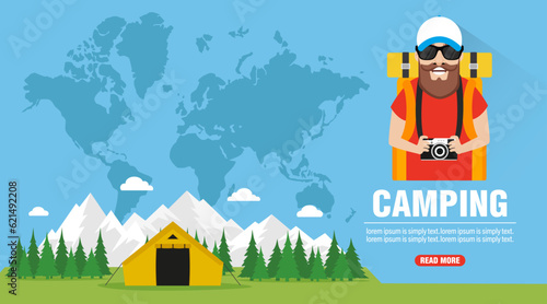 Time to travel. Camping concept design flat banner
