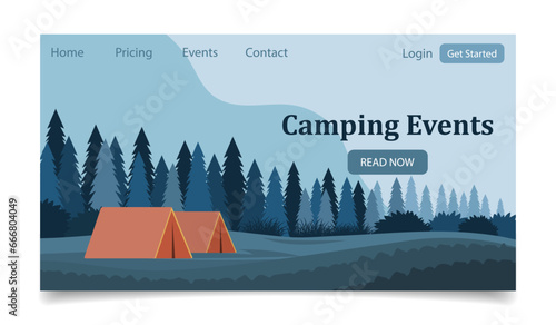 Camping events. Tourist tent against the backdrop of a forest landscape. Banner, template, landing page. Illustration, vector