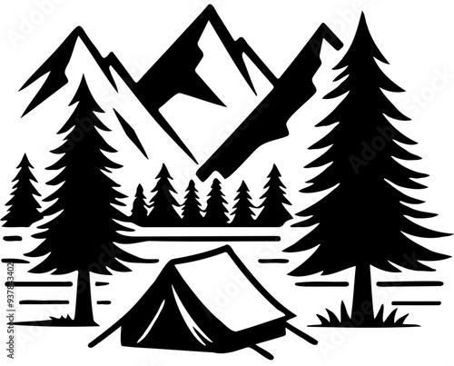 Simple black and white camping scene photo with mountains in the background, pine trees on the sides, and a tent in the foreground with no shading or color fill.
