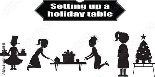 Kid decorating Christmas tree at party. Cute happy child wearing xmas dress vector illustration. Smiling little girl putting toys, garland decoration on new year tree indoor