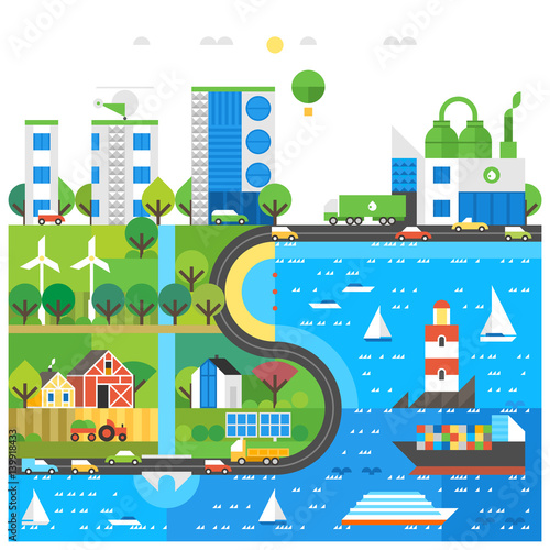 Village and landscape flat illustration. Modern city. Ecological holidays. Infographic - modern city, industry, ecosystem and travel. Flat design. Environmental production