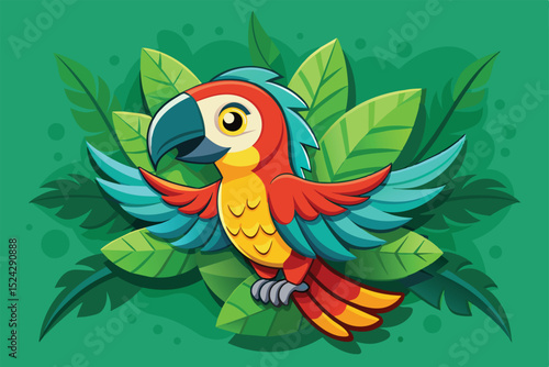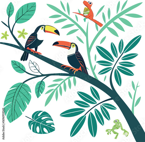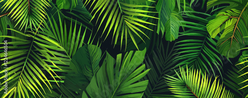 A collection of various green tropical leaves, including monstera, banana, palm, and fern, in a flat vector illustration style.