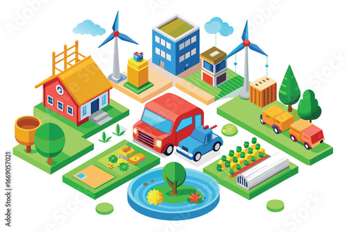 Isometric illustration showcasing a sustainable aviation ecosystem vision