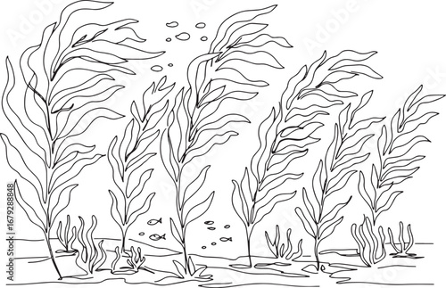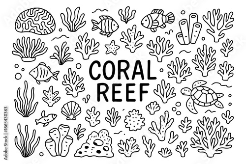 coral reef ecosystem with seahorse, hand-drawn in black vector style