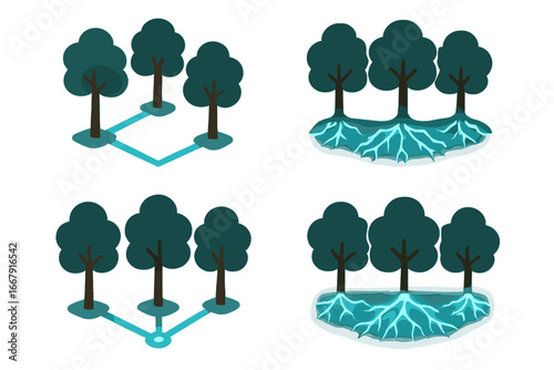 Set of diverse tree root system illustrations, botanical underground plant structures, nature growth patterns, ecosystem design