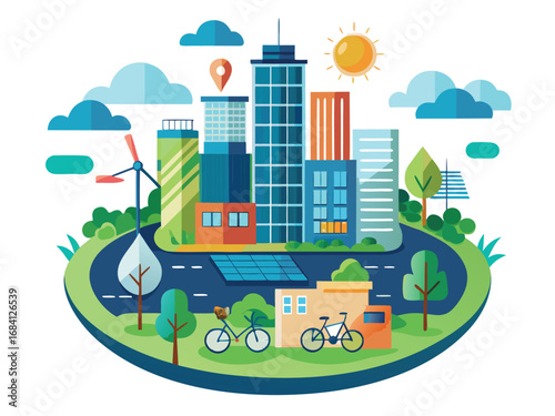 Vector cartoon cityscape with buildings, trees, clouds, and green grass representing urban ecology and nature design