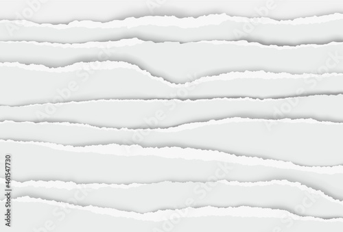 Set of white torn notebook paper pieces. Ripped paper strips. Realistic notepad sheets, scraps of notebook page, with torn edges. Vector illustration.