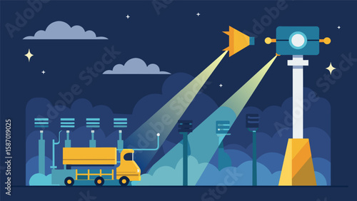 The steady hum of generators powers the floodlights providing a steady stream of light to guide the workers through the night.. Vector illustration