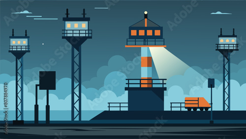 The large floodlights standing tall on the construction site are reminiscent of lighthouses guiding workers through the darkness to complete their. Vector illustration