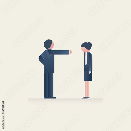 Male boss scolding or reprimanding female worker. Symbol of gender inequality, discrimination, man domination.