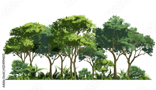Vector tropical forest trees greenery landscape on transparent background, environmental greenery, lined trees, nature forest, tropical jungle, green environment, serene landscape