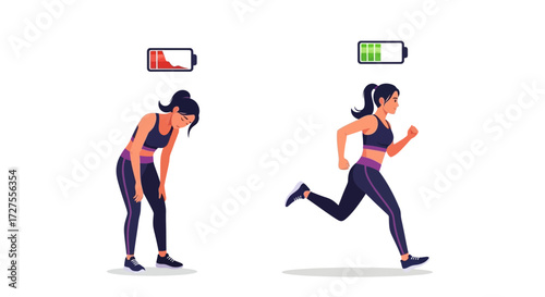 Set of happy and unhappy female office workers and vital power or battery charge indicator. Energetic and tired or exhausted girls and life energy indicaion. Flat cartoon colorful vector illustration.