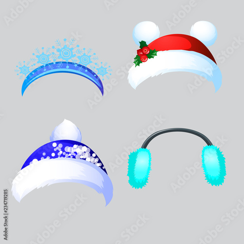 A set of hat and headbands in the style of Christmas and New year isolated on grey background. Vector cartoon close-up illustration.