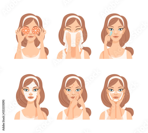 Face Care Routine with Young Woman with Headband Engaged in Daily Skincare Vector Set