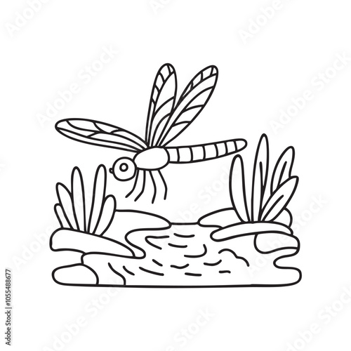 Oasis Coloring Page. Palm oasis in the desert children?s coloring book illustration, outlined drawing, palm trees surrounding a small pond with a camel resting