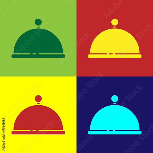 A hand holding a serving dish with a cover in cartoon style. Cloche, tray lid, or a dome with a plate. Food service and restaurants. Vector colorful illustration isolated on a white background is suit