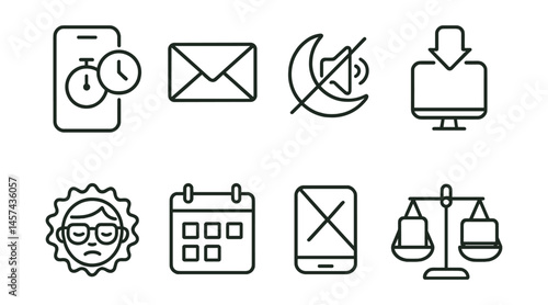 Line style icons of healthy screen behavior: log out icon, app time limit badge, stop scrolling tag, sleep and screen file, screen-free break board, app balance chart, phone down bubble, screen