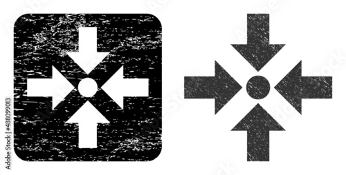Vector shrink arrows stencil icon. Grunge shrink arrows stamp, done from icon and rounded square. Rounded square seal include shrink arrows cut out shape inside. Vector shrink arrows grunge images.