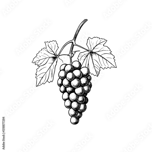 Detailed engraved vector design of a grape cluster with leaves suitable for tattoo art
