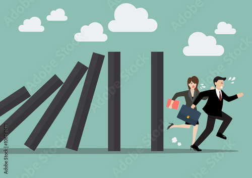 Domino effect or business resilience metaphor vector illustration concept. Adult young businessman run away from falling domino line business concept problem solving and danger domino chain reaction.