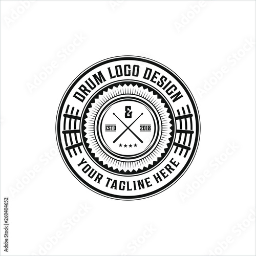 Vector logo of rock school or rock band. Snare drum with drumsticks. Rock music label.